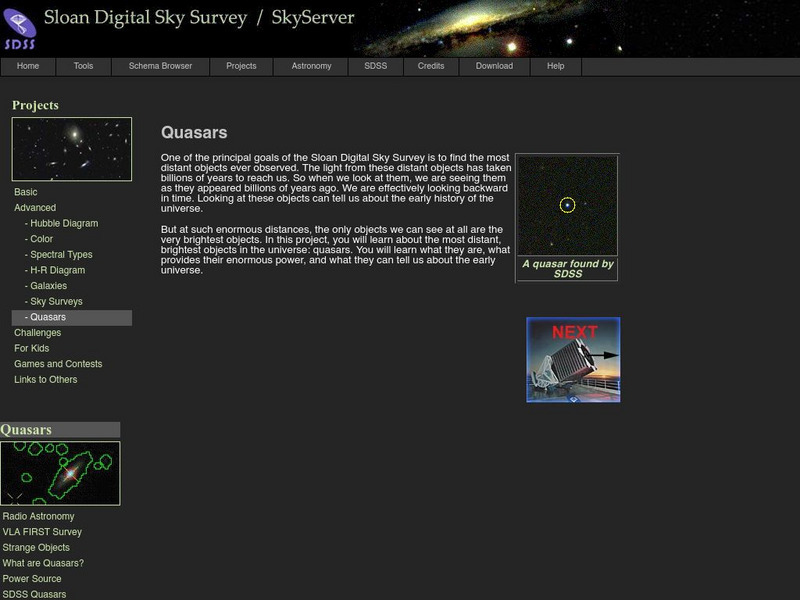 This site from the SkyServer offers information as to what quasars are as well as provides links to strange objects, radio astronomy and research. This is a great sit to check out the brief but factual information on the subject.