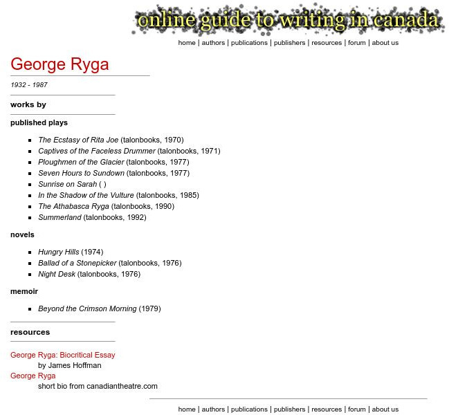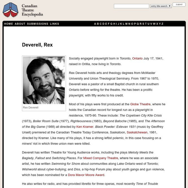 Offers biographical material and information on award winning Canadian playwright, Rex Deverell.