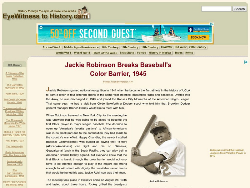 Information on baseball legend Jackie Robinson who became the first African American player to play in the major leagues. Contains Dodger manager Branch Rickey's account of the interview with Robinson offering him this chance.