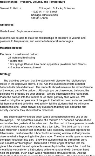 From the Science and Mathematics Initiative for Learning Enhancement (SMILE) program. A lesson plan that centers around a lab investigating the gas laws of Boyle, Charles, and Gay-Lussac. Data is collected, analyzed and discussed.