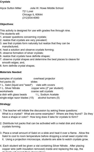 From the Science and Mathematics Initiative for Learning Enhancement (SMILE) program. A lesson plan analyze crystal samples and generalize about the six basic shapes of crystals. The formation of crystals is illustrated through various...