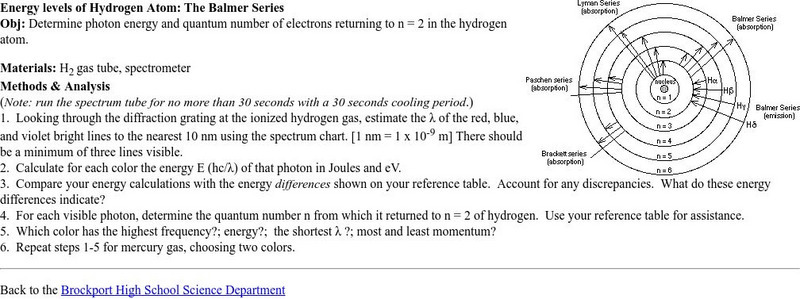 From the Brockport High School Physics Labs web pages. Includes an excellent graphic depicting the energy levels of a hydrogen atoms and portraying the electron level transitions for the Lyman, Balmer, and Paschen series. Includes both...