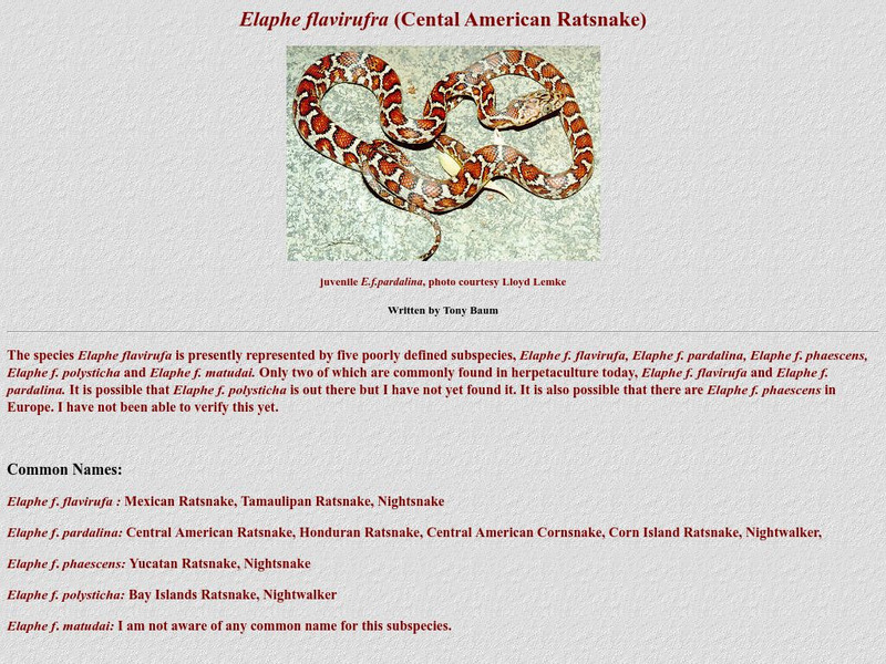 With a general overview of the Central American Ratsnake, Kingsnake.com introduces five subspecies, common names, range, behavior, habitat, size, coloration, pattern, and color photo.