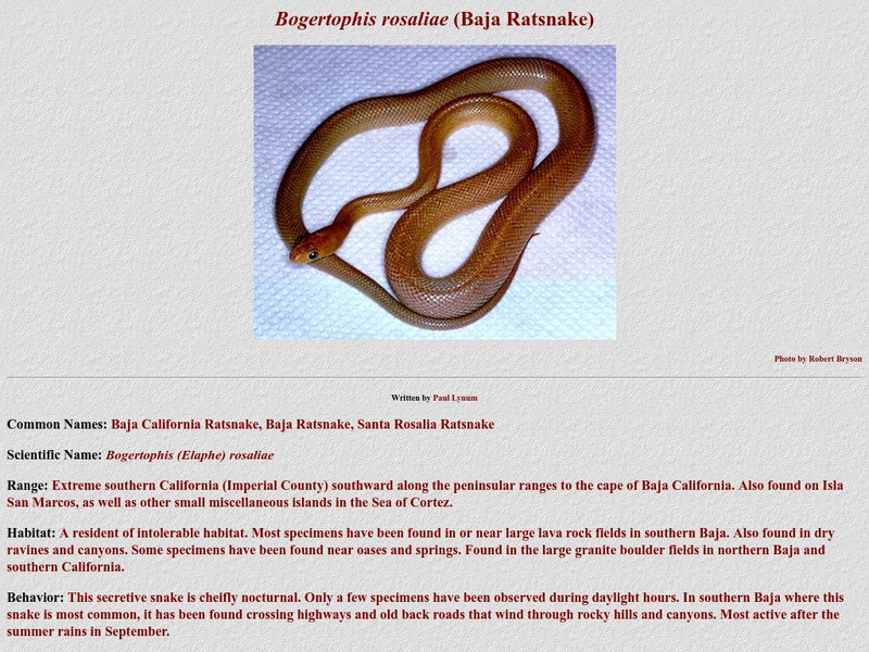 Found in Southern California, the Baja Ratsnake is profiled by Kingsnake.com. Color Photo included.