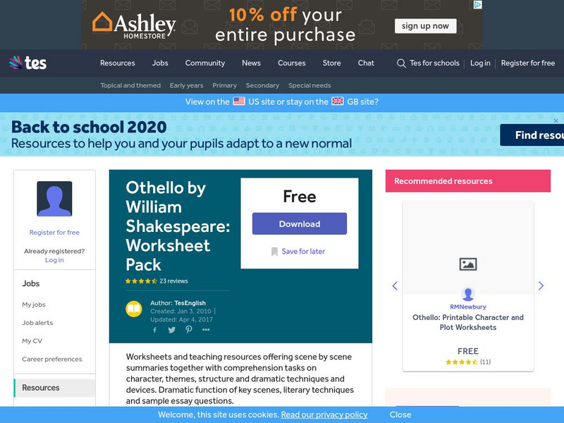 Tes: Othello by William Shakespeare: Worksheet Pack