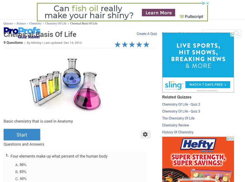 An online quiz with nine questions about the chemistry of the human body and of other life. Has ads, which may be distracting.