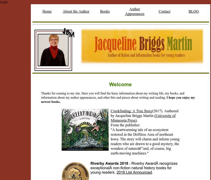 A comprehensive site about the Caldecott Award winning author, Jacqueline Briggs Martin features biographical information, book links, curriculum ideas, photographs, and related resource links.