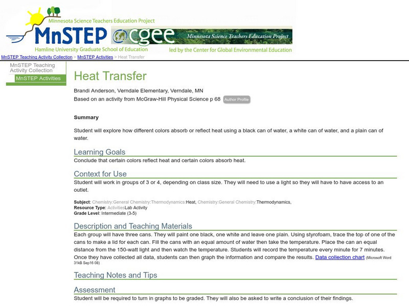 Students explore how different colors absorb or reflect heat using a black can of water, a white can of water, and a plain can of water.