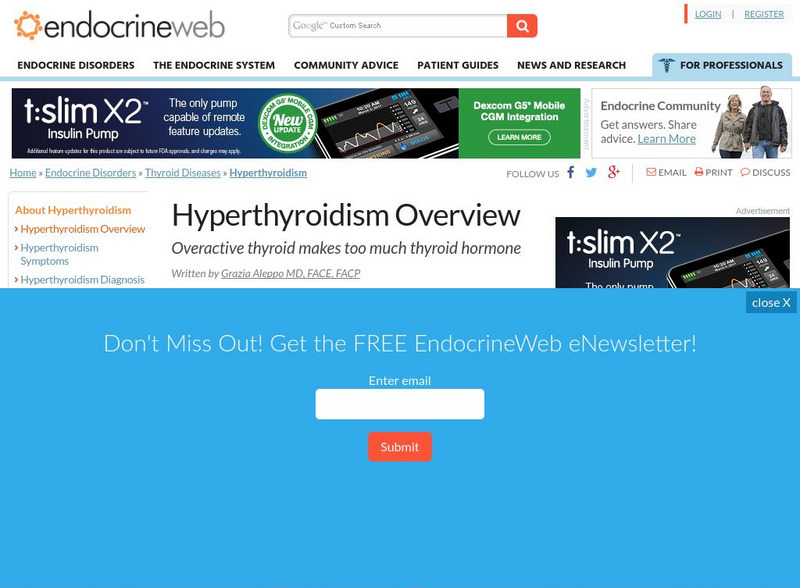 Provides a complete overview of hyperthyroidism. It begins with a topic overview, which includes a small chart and links to further information, then it discusses causes, symptoms, risks, and treatment.