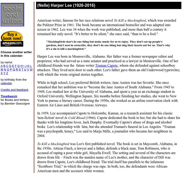 Learn more about the life and work of Harper Lee when you visit this informative site. This site provides links to activities, vocabulary lessons, newspaper articles and more focused on the book "To Kill A Mockingbird."