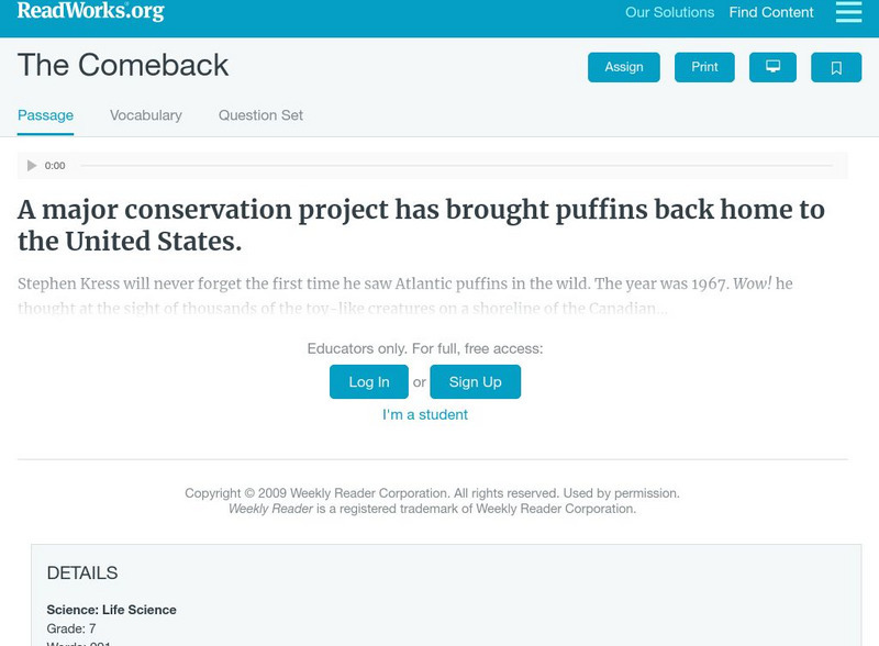 [Free Registration/Login Required] An informational text about a conservation project designed to bring Atlantic puffins back to the United States. A question sheet is available to help students build skills in reading comprehension.