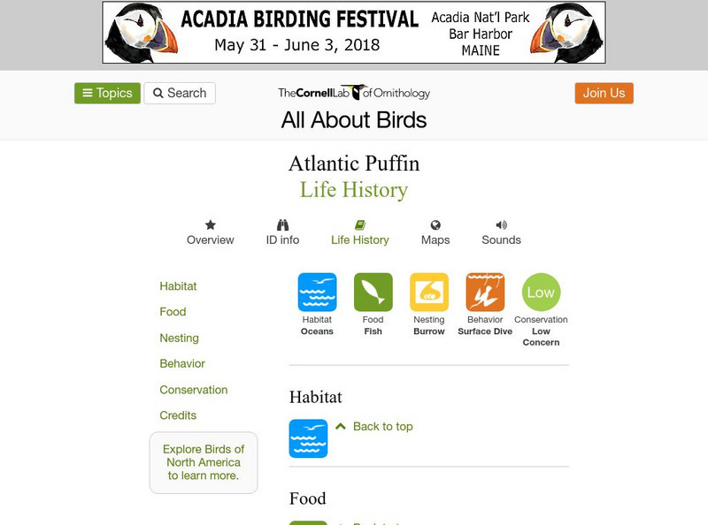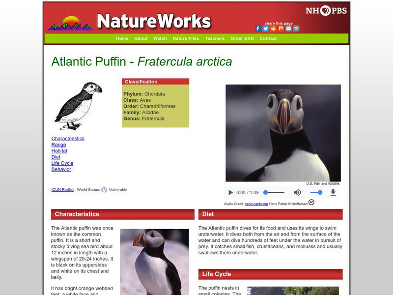 Find out more about the characteristics of the Atlantic Puffin when you visit this educational resource. This site includes information on reproduction, range, habitat and more.
