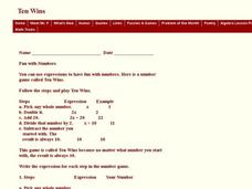 In this algebra worksheet, 11th graders rewrite word problems using algebraic symbols. They play a game of Ten Wins by following specific steps to see that they will always end with the number 10. An answer key is provided.