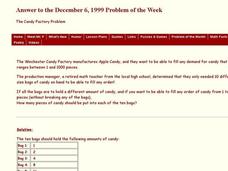 For this word problem worksheet, students solve 1 word problem in short answer format. Students determine the amount of candy to put in ten bags to fill any order between one and one thousand.