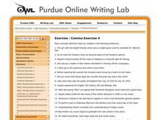Reinforce comma rules with this exercise. Learners add commas to a series of sentences and, using a list of eleven rules, match the rule they followed to each sentence. This worksheet would be best for classes that have had fairly...