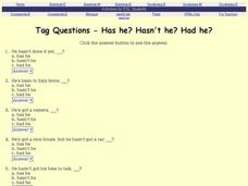 This resource assesses learners on their knowledge of question tags and their placement in sentences. Six multiple-choice questions are provided, and learners must select the appropriate answer for each. A detailed answer guide is also...