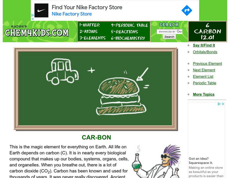 Click on the left navigation terms for some great information about the 6th element in the periodic table, "carbon." Content focuses on carbon's electrons, where you can find carbon in nature and in the home, and how carbon combines with...