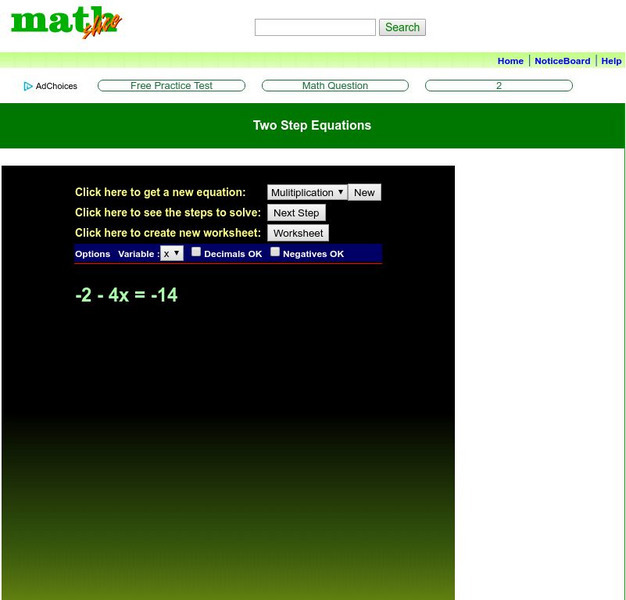 This tool allows you to create multiplication and division worksheets with two-step equations. The worksheets can have varying difficulty levels that may include decimals and/or negative numbers. Clicking on "Next Step" reveals the next...