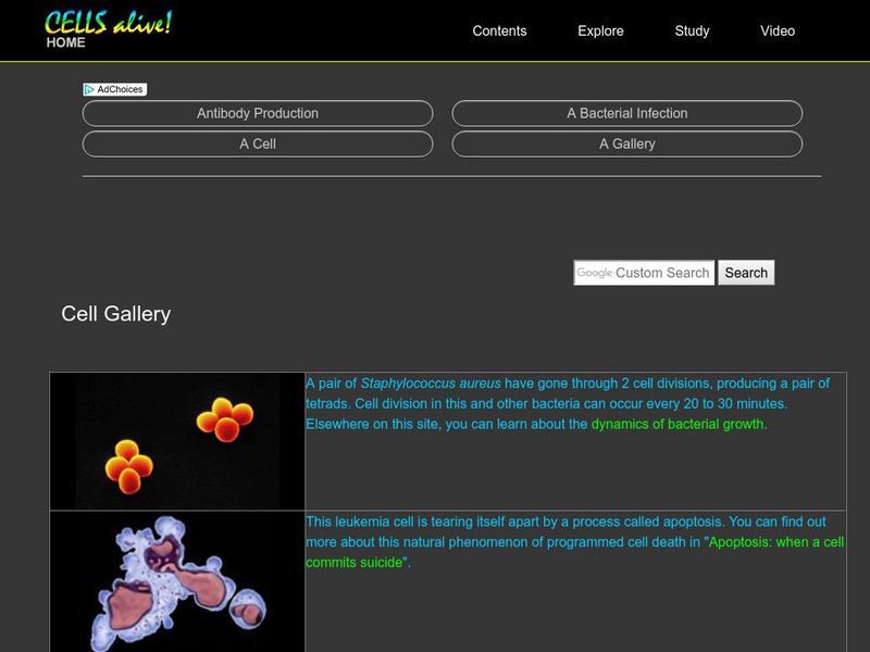 This gallery shows pictures of a variety of cell types with hyperlinks to additional information about cells. Very interesting pictures.