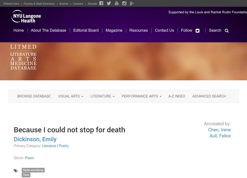 This New York University site on Emily Dickinson's poem, "Because I could not stop for Death," includes a link to the online poem, a link to Emily Dickinson information with ten additional poems, and a summary of the poem.