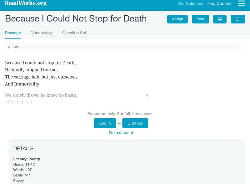 A learning module that begins with "Because I Could Not Stop for Death" by Emily Dickinson, accompanied by guided reading questions, assessment questions, and discussion questions. The text can be printed as a PDF or assigned online...