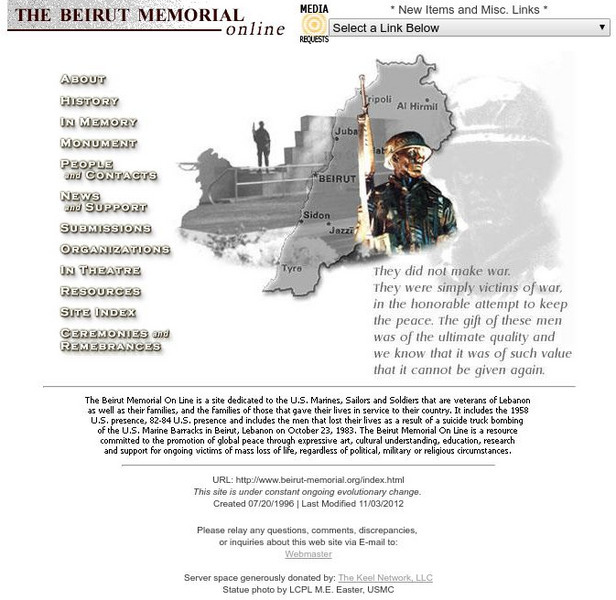 This site is dedicated as a memorial to the US veterans of service in Lebanon. It contains links to history, news, support, remembrances, and other resources.