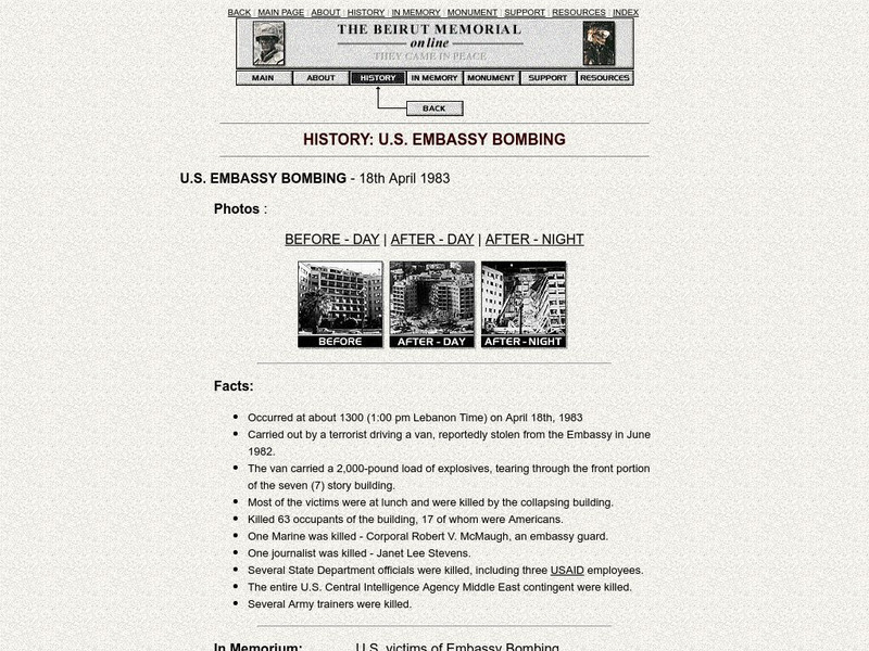 A bulleted list of facts about the US Embassy bombing in Beirut. Also contains good before and after photos of the Embassy, as well as links to photos of President and Mrs. Reagan honoring the victims.