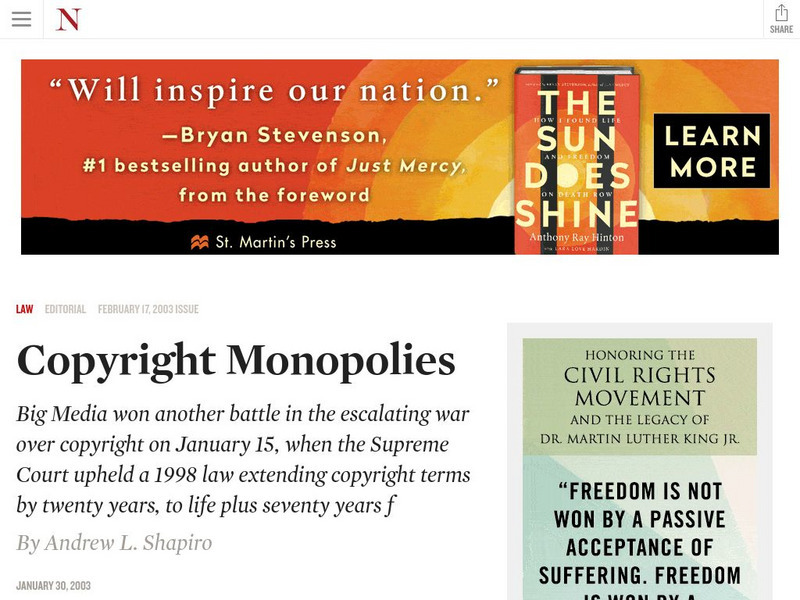 This magazine article discusses the 1998 Copyright Term Extension Act and its impact on society, public domain, the First Amendment, and monopolistic power in the USA. (Feb. 17, 2003)