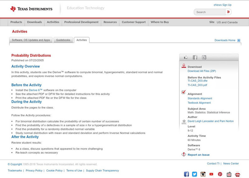 In this activity, students use the Derive software to compute binomial, hypergeometric, standard normal and normal probabilities, and explore inverse normal computations.