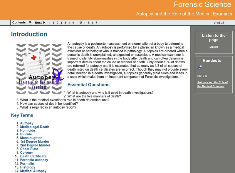 In this comprehensive interactive tutorial you will explore the area of forensic science, particularly the part of an autopsy and why it is used in death investigations. The five manners of death are explained as well as the medical...