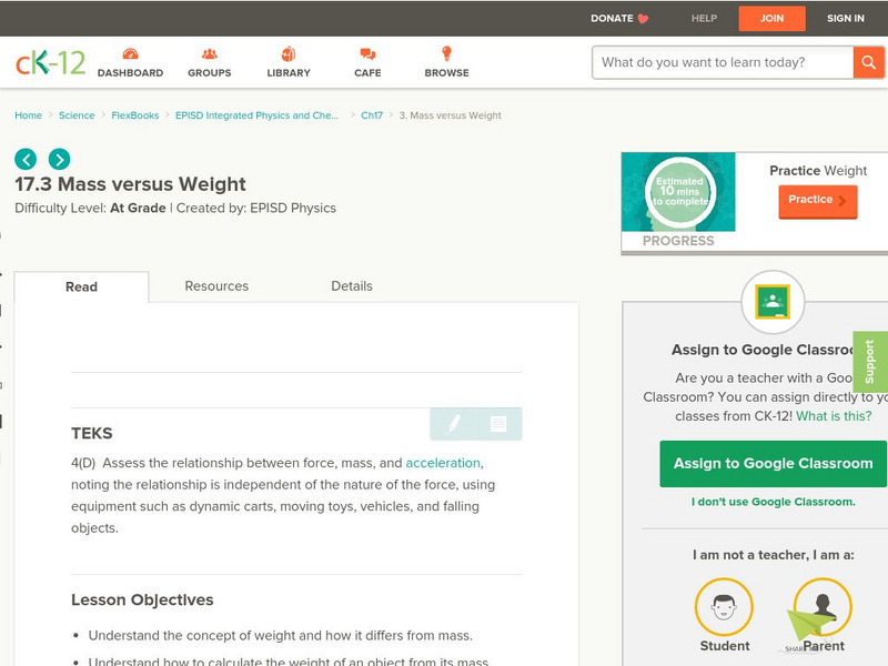 [Free Registration/Login may be required to access all resource tools.] Students explore the concept of weight and how it differs from mass, and then they have the opportunity to calculate the weight of an object from its mass.