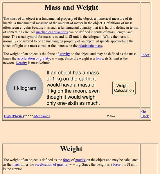 Site from HyperPhysics dealing with the topic of mass and weight. In addition the site deals with weightlessness. The numerous links to other pages help the student see how ideas are interrelated.