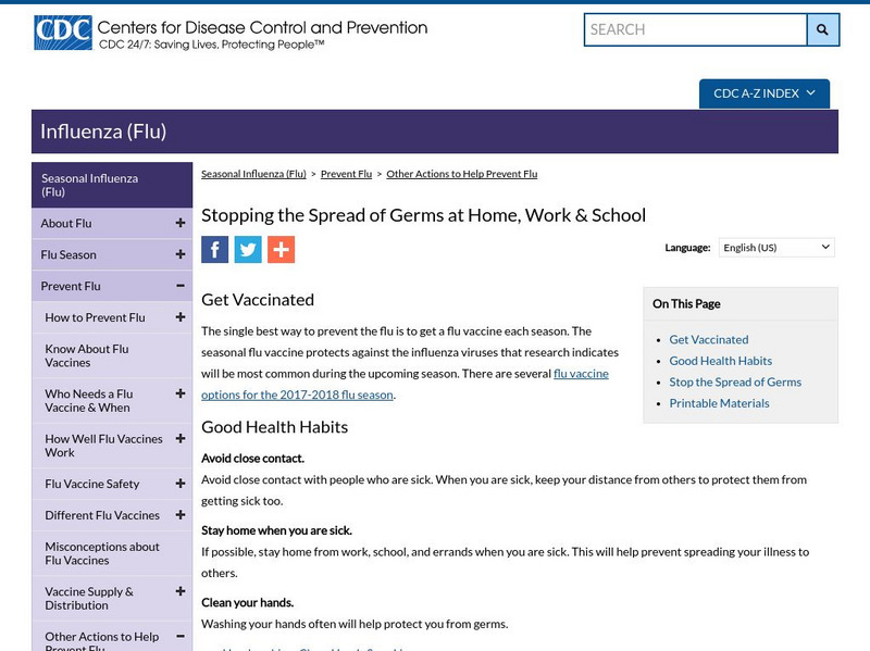 This page lists "good health habits" to help prevent the spread of the flu and links to pages on handwashing and resources for stopping germs and flu virus in school and work environments.