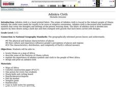 Students locate Ghana on a map of Africa and discover features of Ghana culture. They synthesize the importance of Adinkra symbols and cloth to the people of West Africa and design an Adinkra cloth.