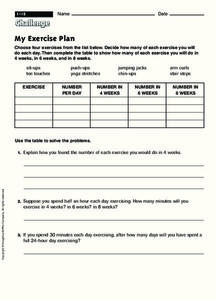 In this exercise plan worksheet, students complete a chart where they calculate how many exercises they would do over a period of time. Students complete 4 calculations for 4 different exercises and answer 3 questions.