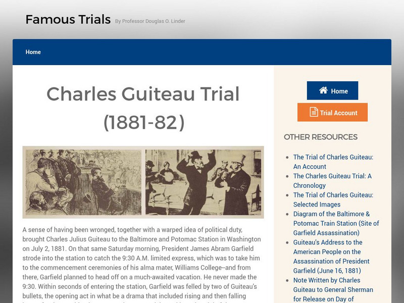 From Douglas O. Linder's extensive website covering famous trials primarily in U.S. History, this famous trial is the Garfield Assassination Trial of Charles Guiteau. Find the chronology of events, a diagram of the train station where...