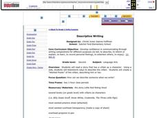 Young scholars explore the five senses and how to incorporate them into their writing to make it come to life. In this descriptive writing lesson, students must describe objects by touching them without seeing, and describe...
