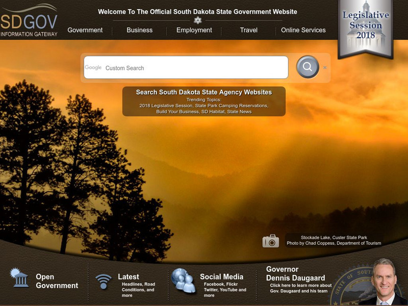Official site for South Dakota provides information on state government, business, family, health, education, employment, travel, and parks.