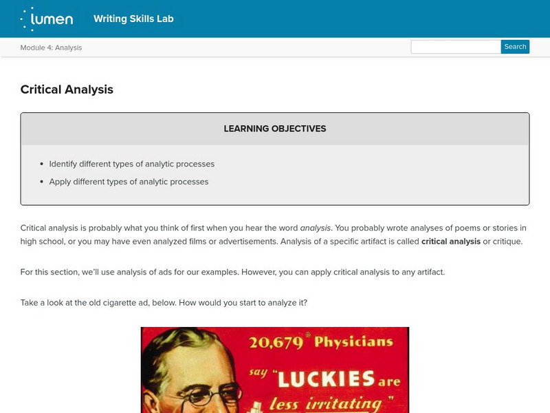 This lesson focuses on critical analysis including a definition, a discussion of the three types of structure for critical analysis, and a practice activity.