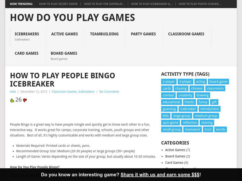 Instructions for how to play the icebreaker activity People Bingo. The game uses bingo cards that list interesting facts about people. Students must collect signatures of peers who fulfill the facts listed in the sqaures until they have...