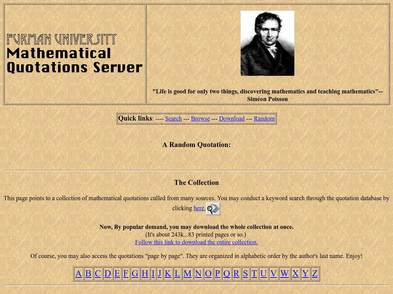This Ferman University site allows you to search for quotes by famous mathematicians. A site for peeking the interest of students and incorporating math history into the classroom. Also a good resource for math research projects.