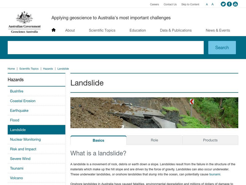 Provides information on recent Australian landslides, maps of Australian landslides, landslide risk assessment, a survival guide, and a shore safety pamphlet. Use the toolbar to your left to navigate through the different information on...