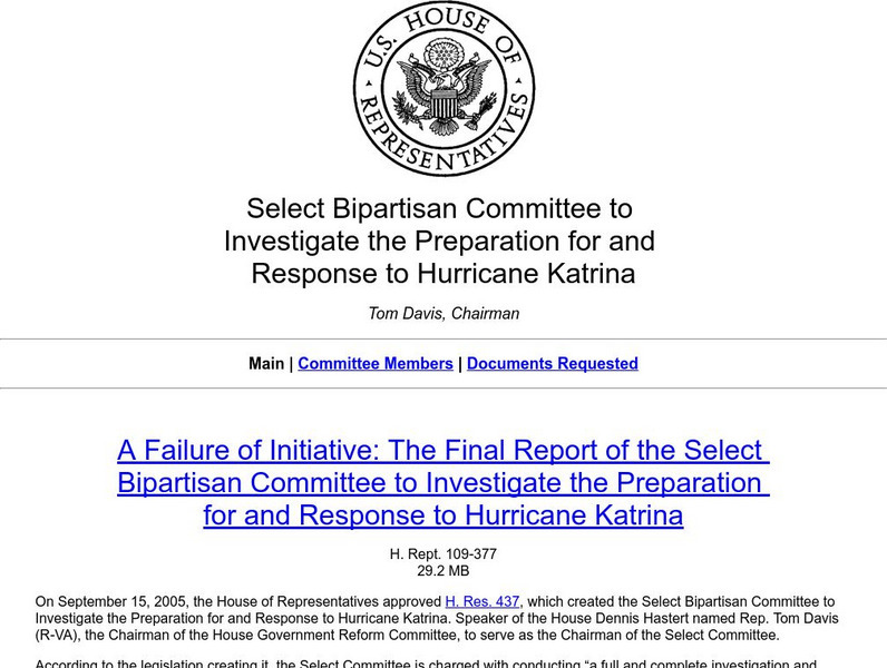 A February 2006 report based on a House investigation into the local, state, and federal response plans to Hurricane Katrina. The findings found a long list of mistakes that were committed.