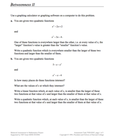Read between the curves ... quadratic curves! Young scholars analyze the graphs of two quadratic functions by writing their own function whose outputs are between the two given. They then consider intersecting quadratic functions and...