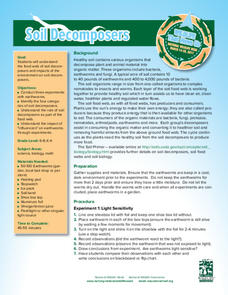 Worms are the kings of the decomposers. A four-part lesson has learners experiment with the characteristics of earthworms and their sensitivities. They vary factors such as light, acidity, temperature, and touch of soil and observe the...