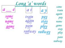 Several words use the long vowel a sound. Match the six words to the correct illustration. Practice saying the word, writing the word, and identifying the written word.