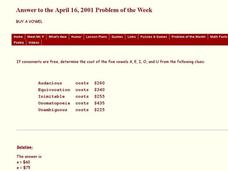 In this problem solving worksheet, students solve 1 word problem about cost. Students are given words with a certain cost and must determine how much each vowel costs assuming consonants are free.