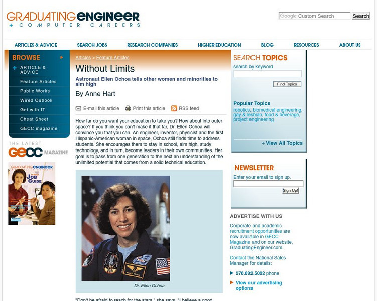 This article features an interview with astronaut Ellen Ochoa in which she discusses minority issues and encourages higher education. A lot of biographical information is also included.