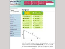 In this tangents worksheet, students use tangent ratios to find the length of the sides of right triangles. This one-page worksheet contains 10 multi-step problems. Answers are provided.