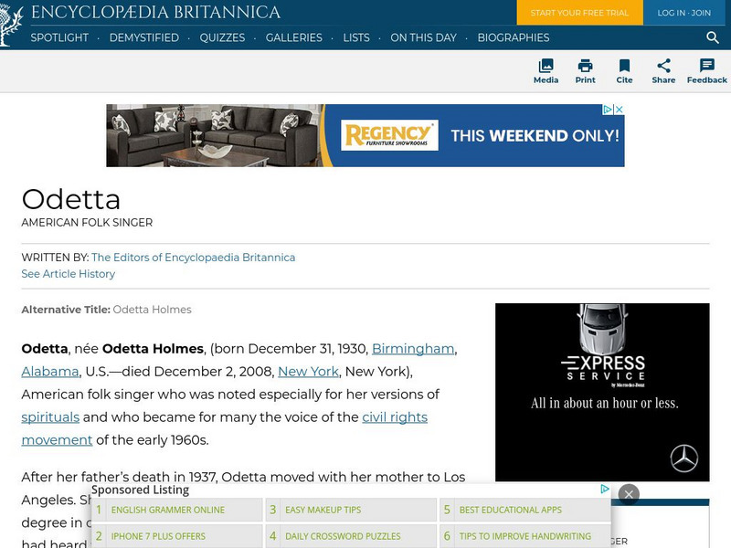 This entry from Encyclopedia Britannica features Odetta, an American folk singer who was noted especially for her versions of spirituals and who became for many the voice of the civil rights movement of the early 1960s.